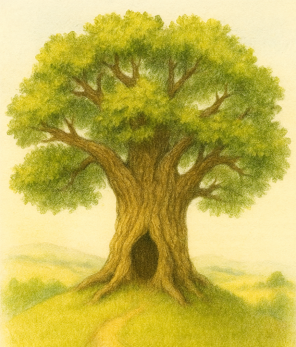 "Joj, tak tohle bych tady teda nečekal" řekne si malý ježeček překvapeně, když celý unavený spatří mohutný starý strom na vrcholku kopce.